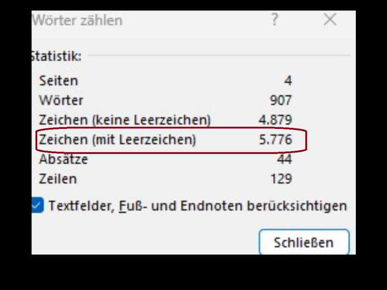 Zeichen inkl. Leerzeichen (hier 5.776) durch 1500 teilen: